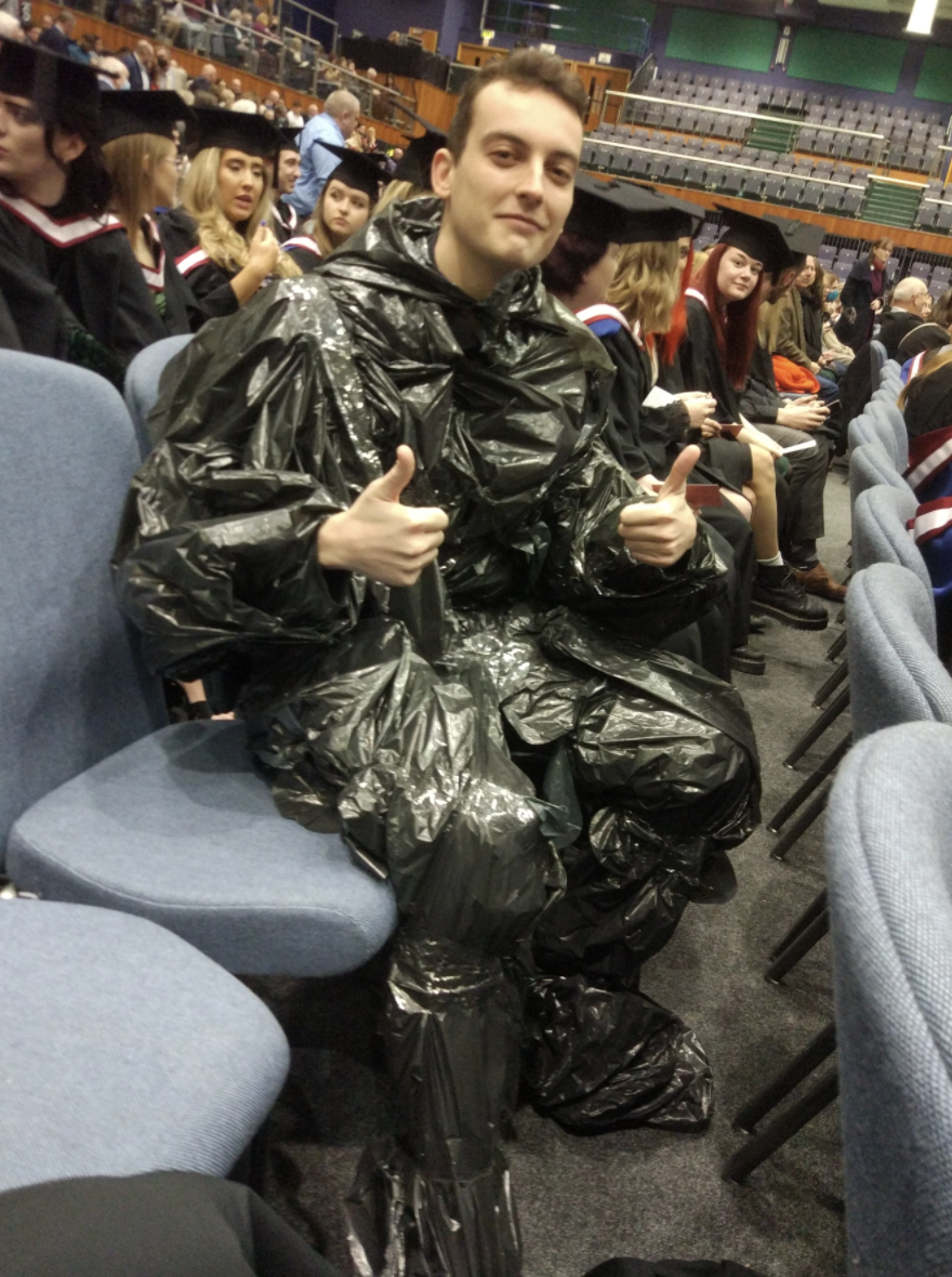 2021年12月01日在英國格洛斯特大學(Gloucestershire University),畢業生租借全套畢業袍要花費246英鎊。這對於很多學生來說是一筆巨款。23歲的Will Radford在該校修讀攝影,11月24日早上,他出席學校的畢業典禮,身上竟穿著用黑色垃圾袋自製的業袍~