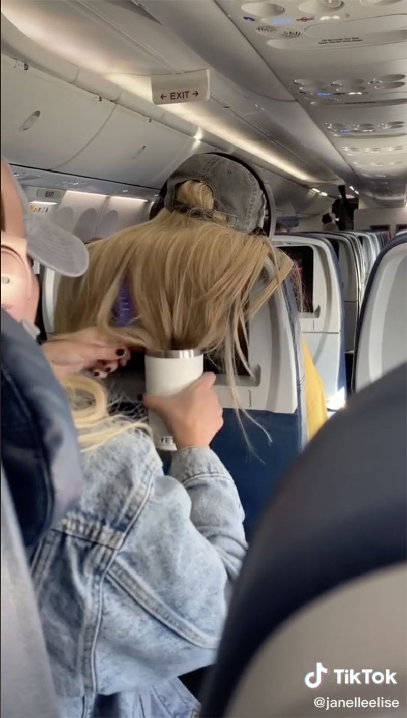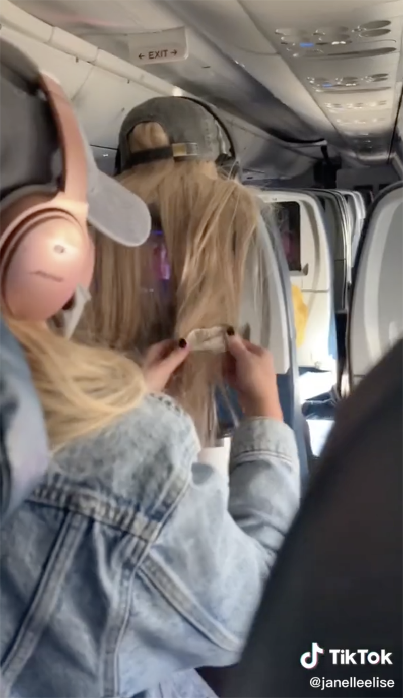 ▼Janelle覺得前方的女乘客太「自我」,決定報復對方,給她一點顏色看看。Janelle將嘴裡的口香糖吐出來,黏在對方的髮尾上,還拿出糖果、棒棒糖黏上去。後來她又把對方的髮尾浸泡在咖啡裡,最後再把頭髮大力甩回她的肩膀上。