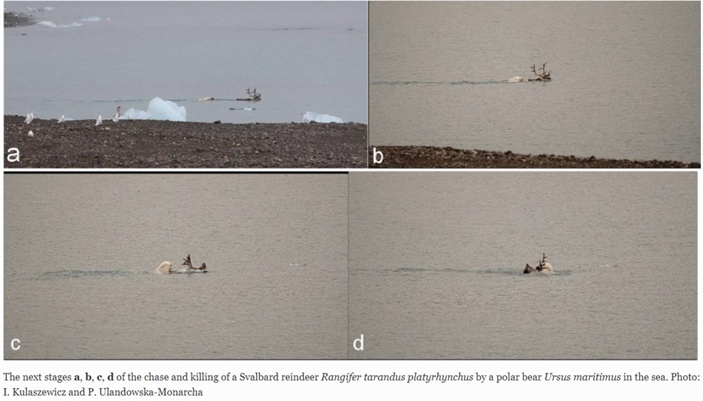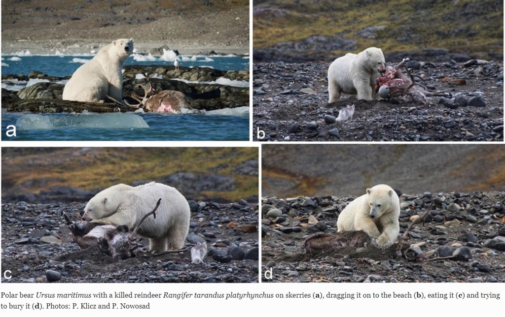 2021年12月04日日前波蘭研究人員拍到了北極熊狼吞虎嚥吃馴鹿的驚人畫面。這件事發生在挪威斯瓦巴群島(Svalbard archipelago),2020年8月21日,波蘭科學站的研究團隊首度用攝影機捕捉到這一幕。那隻北極熊一路追逐馴鹿到冰冷的海水中,最後將牠拖上岸,然後大吃起來。