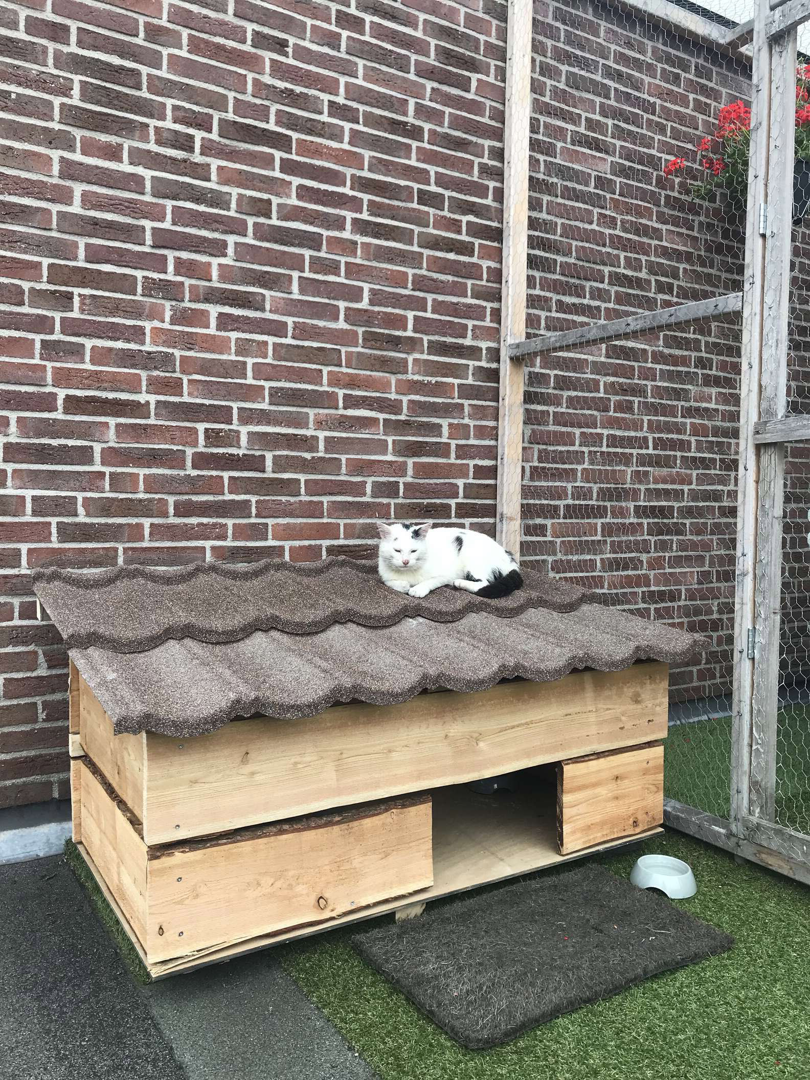 ▼Renee和丈夫在自家院子裡建造了一座豪華貓屋,Ziggy非常喜歡這個小窩,天天在這裡吃飯,吃飽喝足就趴在屋頂上曬太陽,或鑽到小屋裡美美睡一覺。Ziggy在貓屋裡住下來後,對Renee的態度漸漸改變。至少牠吃飯的時候允許Renee摸摸,但吃完飯後就會逃開。