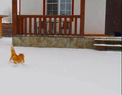 ▼Ginger經常在院子裡跑跑跳跳,無論颳風下雨都不鬆懈,就連下雪天都會跑出去玩。牠在雪地裡奔跑,每跑一步爪爪都會壓到積雪裡,留下一路可愛小腳印。