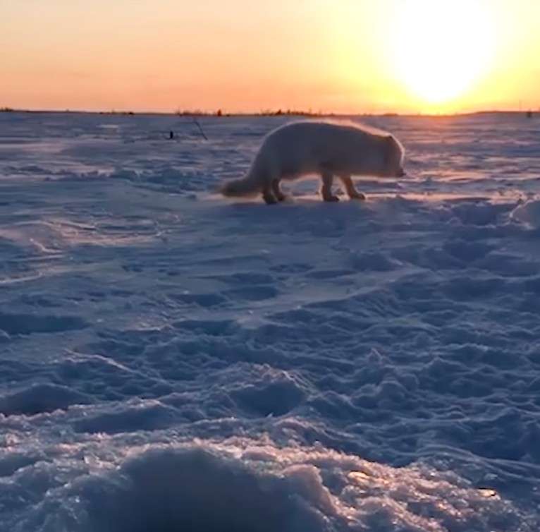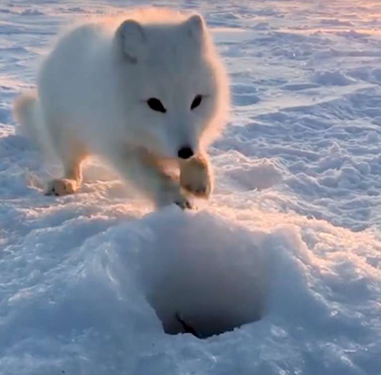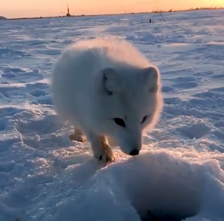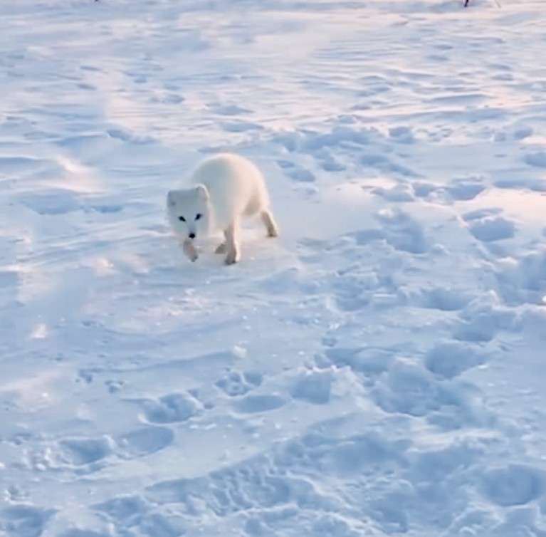 ▼從這段影片中可以看到,這隻北極狐對男子冰釣挖洞放置的魚非常感興趣,一直不斷想要接近偷吃。