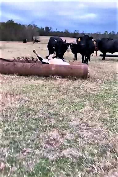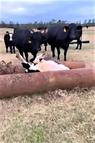 2021年12月10日這是牛牛最尷尬的時刻!日前美國德州納科多奇斯(Nacogdoches)女網友Lisa Anthony回家時,發現自家牧場裡的氣氛怪怪的。一群牛不像平時一樣悠閒吃草,而是聚集在2根舊鐵管附近,牠們到底在做什麼?Lisa仔細看了一下,原來有一隻小母牛被卡在了鐵管之間~