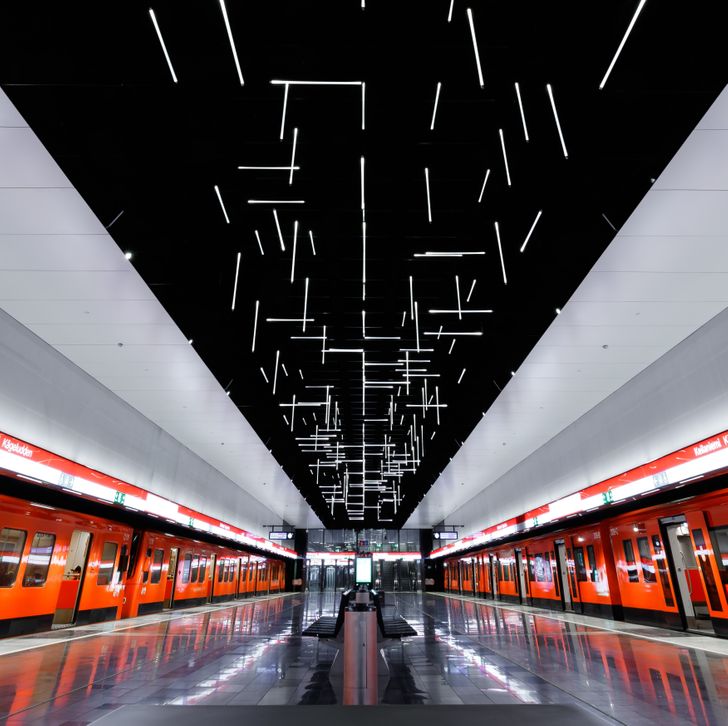 ▼德國漢堡的HafenCity University U-Bahn站:這座地鐵站有12座藝術裝置,鋼架和貨運貨櫃搭建的模塊在燈光中不斷變換色彩,再搭配古典音樂,將地鐵站變成了藝術館。