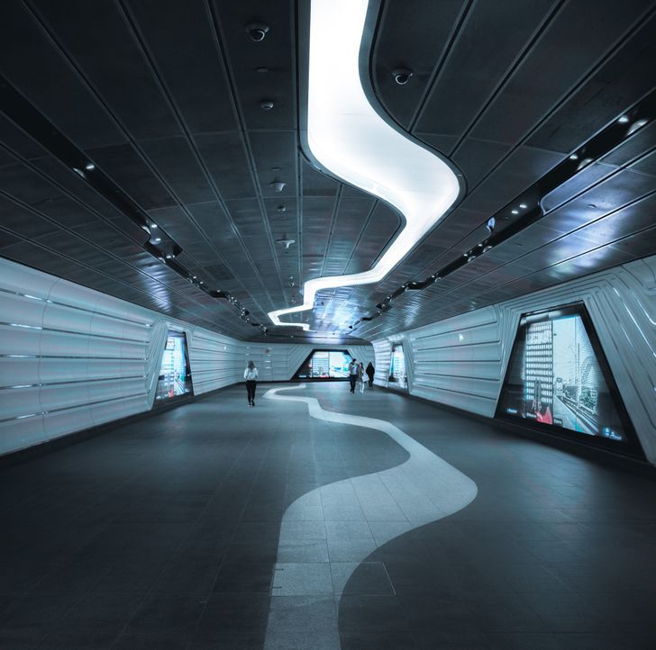 ▼瑞典斯德哥爾摩Odenplan站:車站天花板上的「LED白線」共有400公尺長,營造出迷人的氛圍。