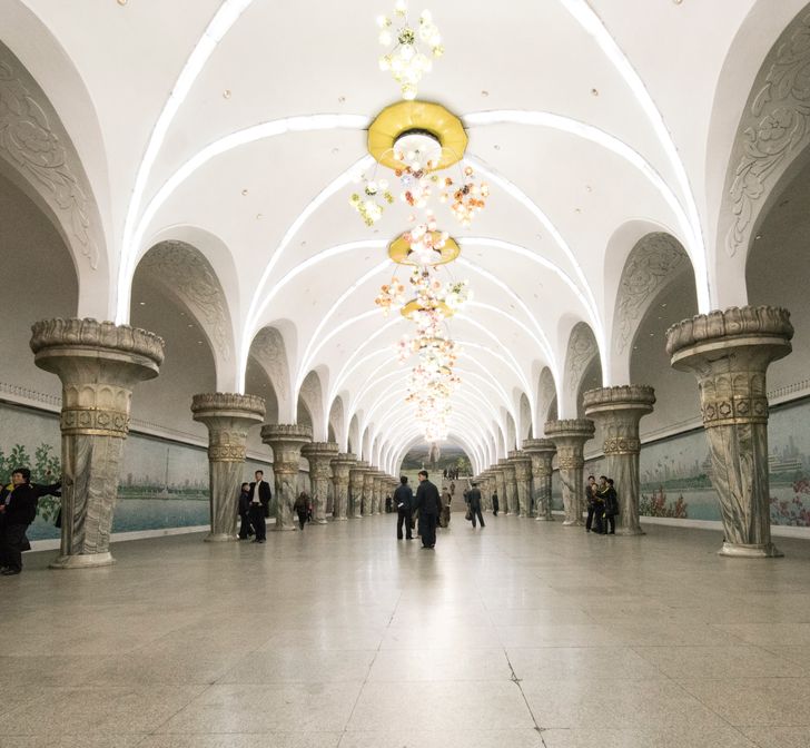 ▼朝鮮平壤地鐵站:這座地鐵站是平壤的標誌性景點之一,擁有豪華的內飾與水晶吊燈和各種大理石。不僅如此,該地鐵站設在地下100公尺處,是世界上最深的地鐵站之一。