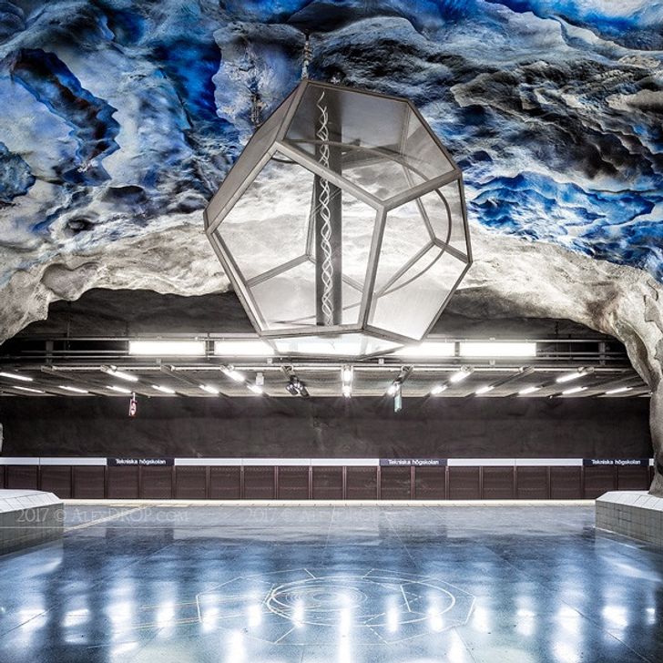 ▼瑞典斯德哥爾摩Tekniska Hgskolan站:這座車站建於1973年,主要是為了方便去往皇家理工學院。因為跟科學和創造息息相關,所以車站內有很多科學元素的裝飾。