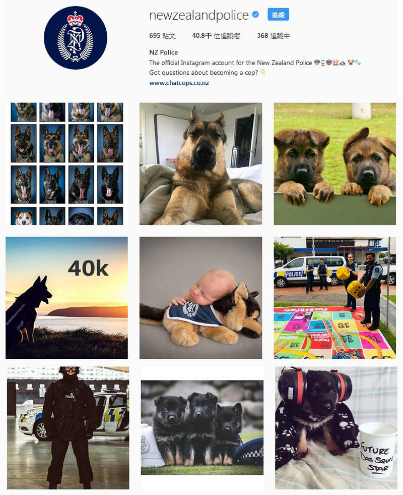 ▼有網友注意到,紐西蘭警方的社群帳號中,總是在曬狗曬小孩,看起來十分悠哉又溫馨,感覺「這個國家充滿了和平」,不似台灣警方的社群網站,充滿各種驚險萬分的緝兇影片。