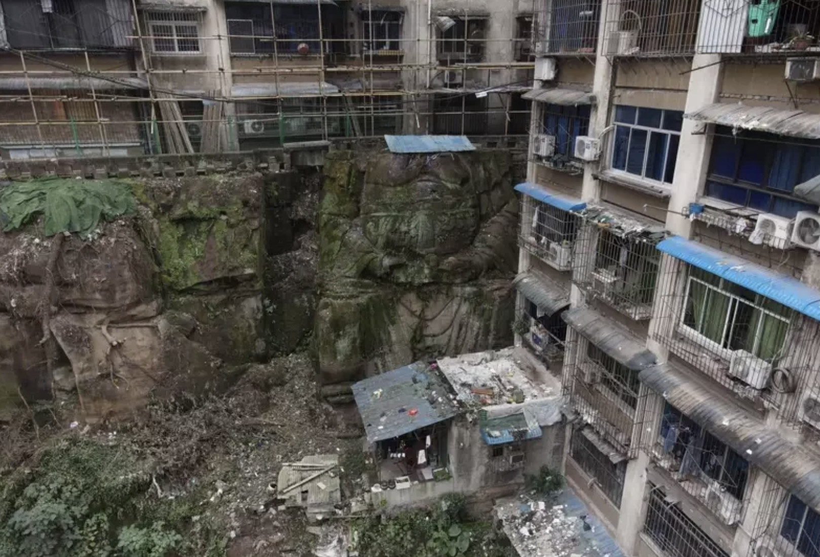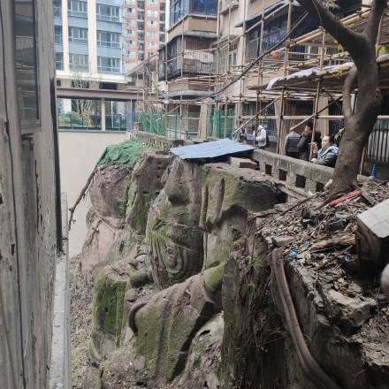 2021年12月13日重慶的地形起伏很大,所以出現了不少在外地人看來非常傳奇的建築。最近重慶一處社區進行外牆拆除,拆到一半竟然出現了一座13公尺的無頭大佛。大家這才發現,整個社區就蓋在大佛的脖子上。據說這座佛像是宋代建造的,已經有上千年的歷史了。