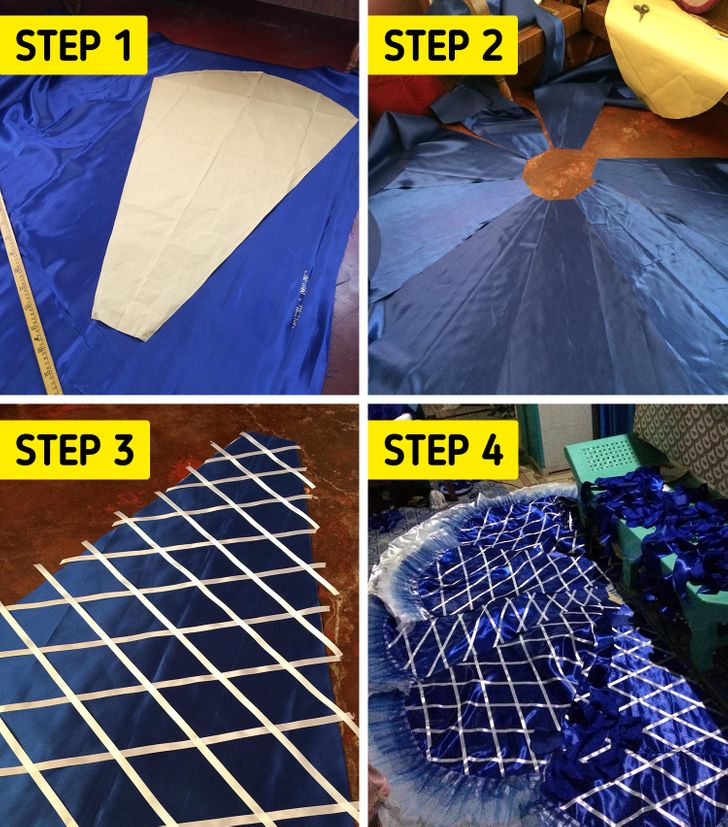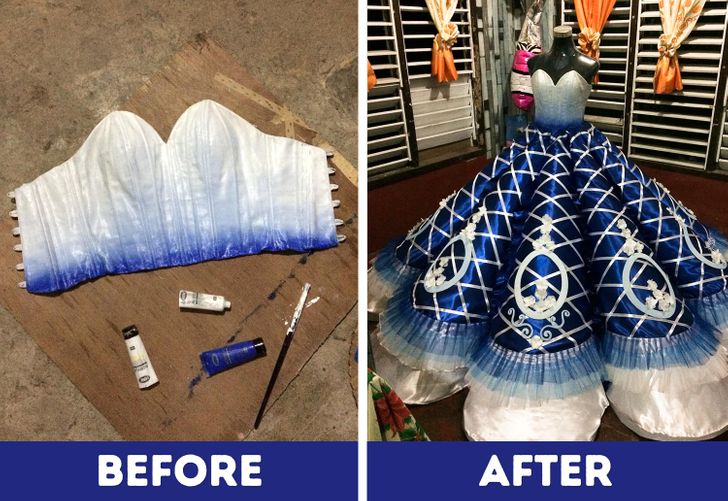▼Maverick將布料剪成蓬蓬裙擺的形狀,貼上交叉的緞帶,再把手作的白色花朵一朵朵貼到禮服上。本來單調的藍色布料經過裝飾,變得華麗又夢幻。