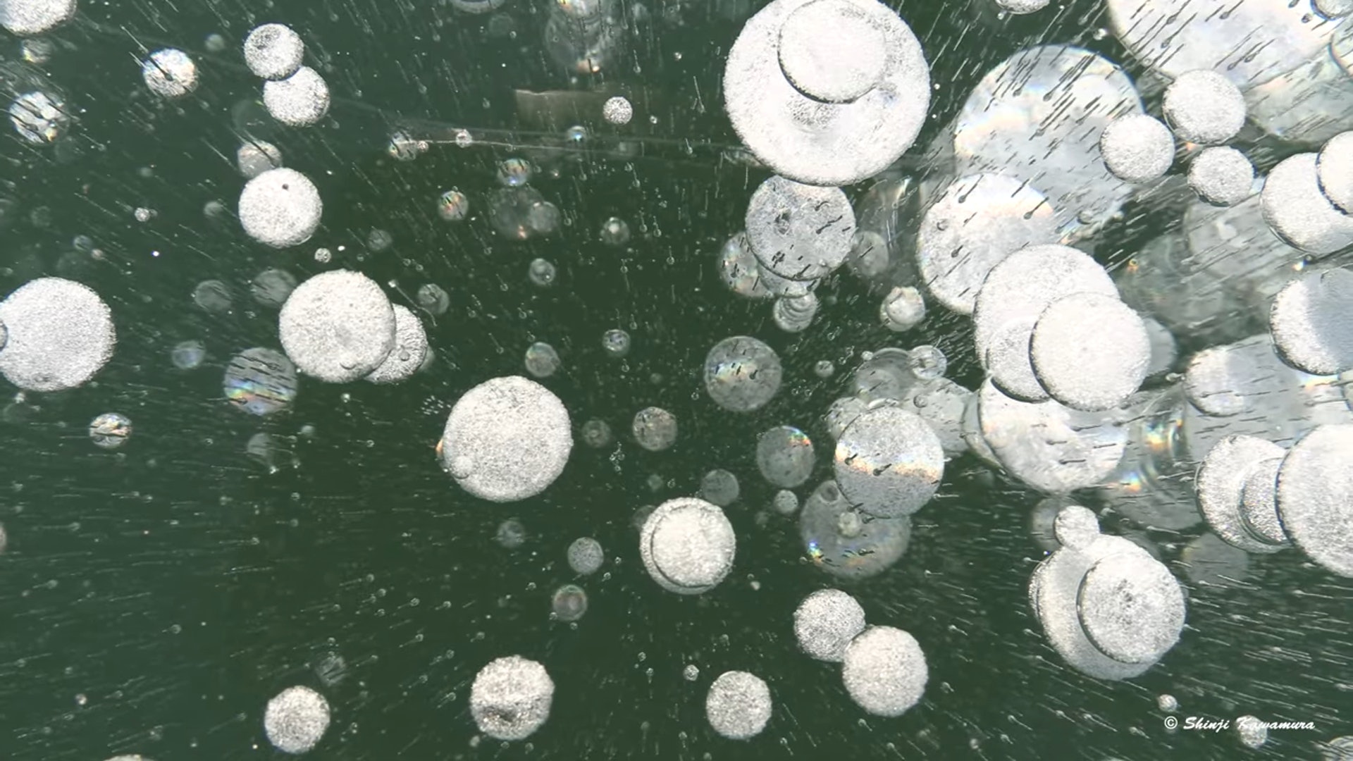 2021年12月14日自然界真奇妙!北海道的冬天有美麗的雪景,除此之外,結冰湖面的「冷凍泡泡」也是當地的一項特色。北海道的冬天非常寒冷,很多湖水都會整塊結冰。在這些大冰塊之下,能看到很多凍起來的「結冰泡泡」,這是北海道冬天的奇景之一。