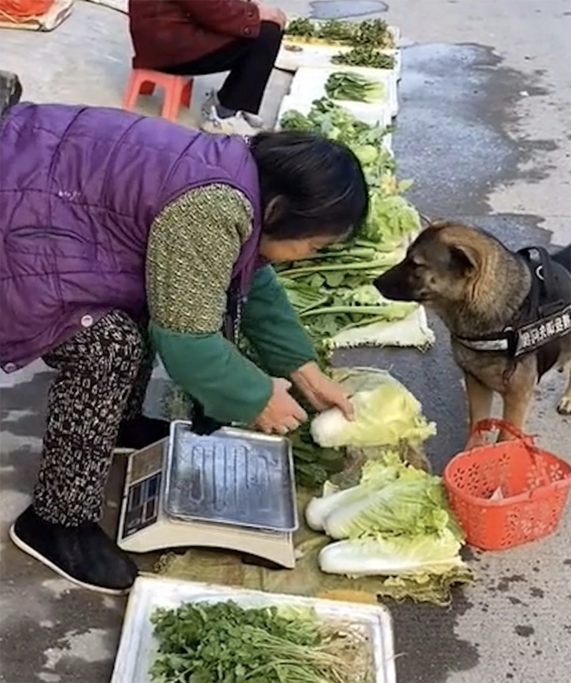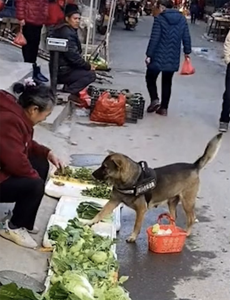 狗狗叼著菜籃跑到一個菜攤前,牠將菜籃放下,抬起一隻前爪拍了拍一顆白菜。賣菜的阿姨連忙將那顆白菜秤重,然後從菜籃裡拿出錢來,找好零錢後和菜一起放進去。