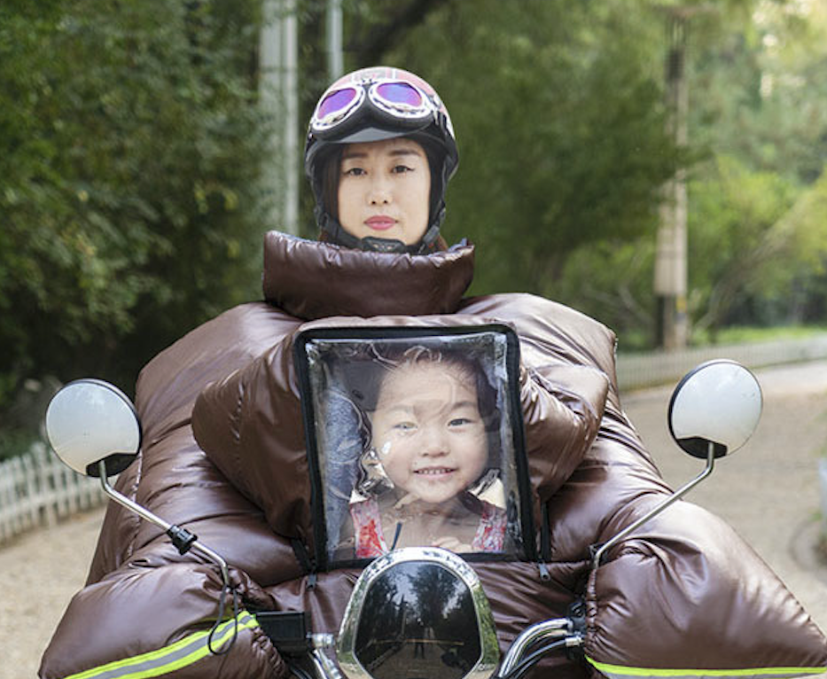 日網友誤會「華人媽拿小孩遺照」騎機車 後來才發現:是親子防寒衣