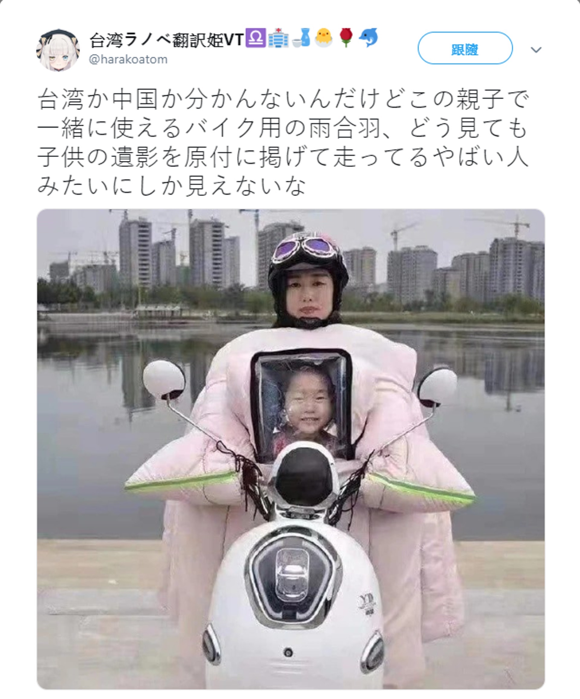其他日本網友看了也覺得很不對,「怎麼會有這樣的設計?」、「感覺冬天會很暖」、「母子一起暖」。也有台灣網友急撇清,「台灣沒有這東西啊!」據說這種機車專用的「親子防寒衣」很常見,只要一入冬季家家戶戶都會用它來保暖。