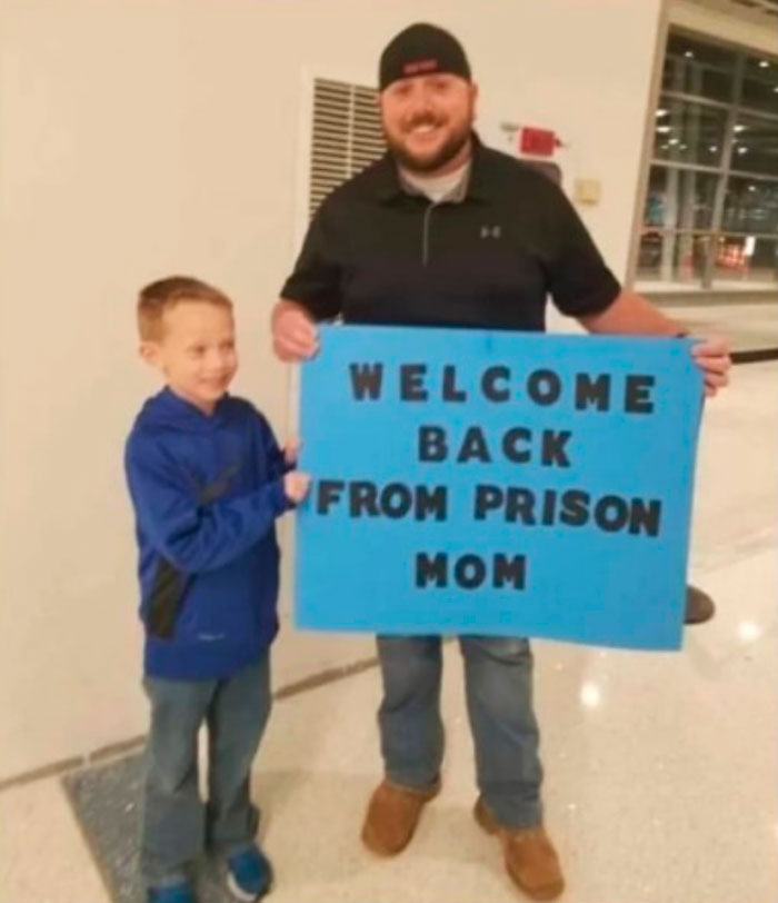 ▼我老婆最害怕尷尬,於是我跟兒子做了這個牌子在機場迎接她回國:「媽媽,歡迎從監獄回來!」