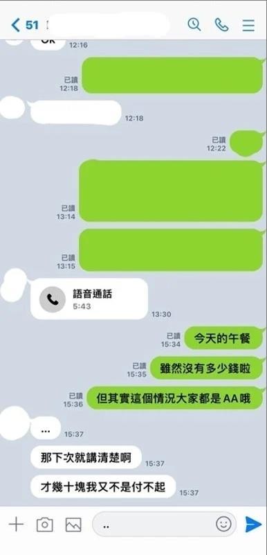 ▼原po表示,雖然沒有多少錢,但事後越想越覺得不合理,於是她私訊同事「雖然沒有多少錢啦,但其實這個情況大家都是AA哦」。對方看到後說:「那下次講清楚啊,才幾十元我又不是付不起!」同事的態度令原po氣炸,她直呼:「我們又不是第一次揪團點歡樂送了,氣死人。」