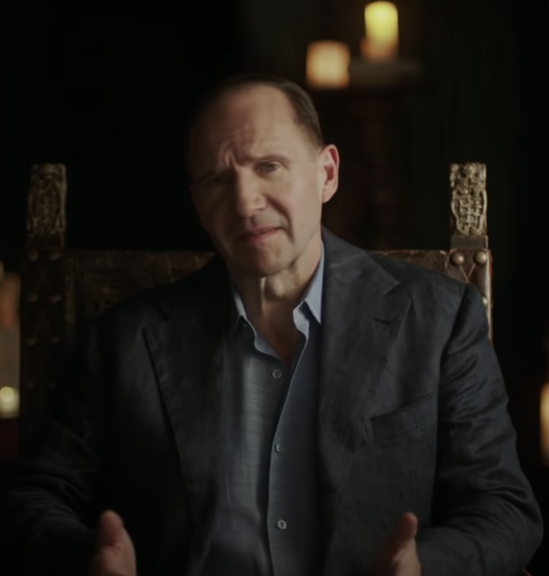▼雷夫范恩斯則獨自坐在佛地魔召集食死人聚會的長桌主位上,皺眉回憶當年拍攝時的場景。他身穿深灰色西裝、藍色襯衫,斯文的模樣跟電影中的佛地魔截然不同。