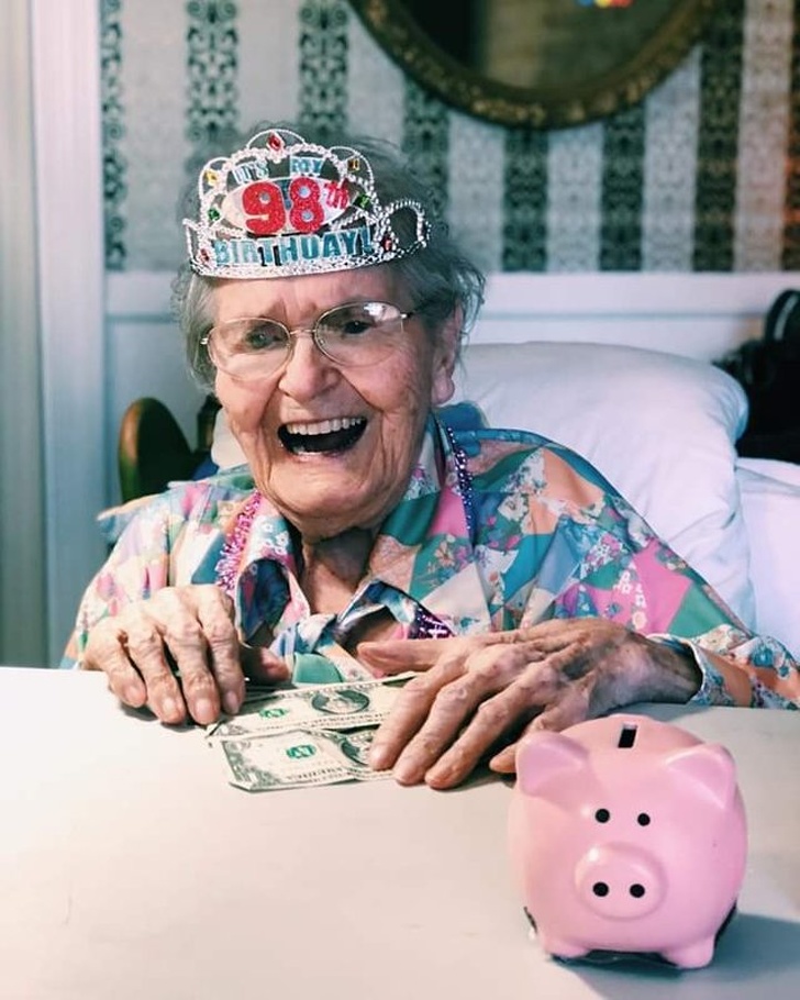 ▼​3.「這是曾祖母的98歲生日!她習慣存錢,家人經常給她零錢。今年她的小豬存錢罐裡能多一些紙幣了。看看她的笑容,她真的很開心!」
