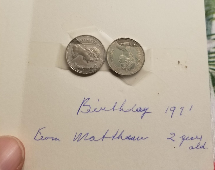 ▼​13.「祖母最近離開了世界,媽媽整理她的遺物時發現了這個。這幾枚硬幣是我2歲時送給她的生日禮物,沒想到她一直保留著。」