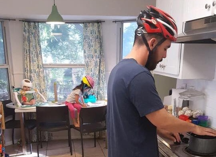 ▼​15.小孩為了矯正頭型,需要戴塑形頭盔。爸爸也戴上頭盔陪她。