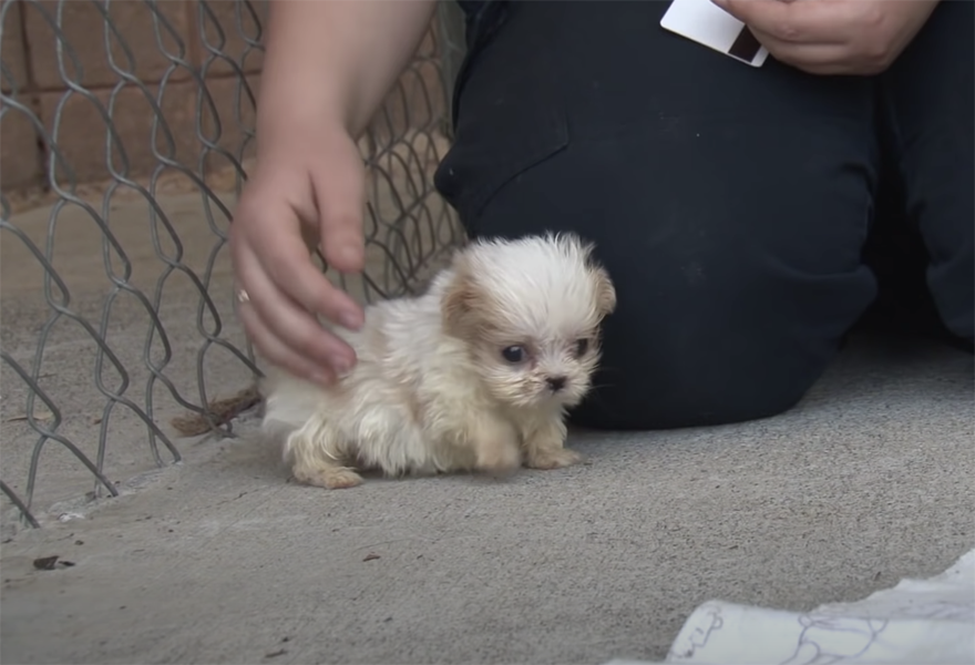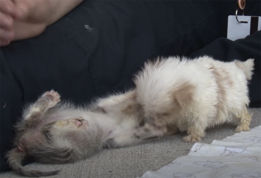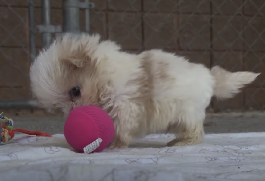 ▼Ruggles體型小巧,只有成年人的手掌那麼大。在狗隻繁殖場的那段時間,牠沒有得到絲毫的關愛,只是被當成一件可以出售的商品對待。被送到收容所後,牠也處於緊張、恐懼的狀態,工作人員都很心疼牠,決定介紹小貓咪Chompers跟牠認識。