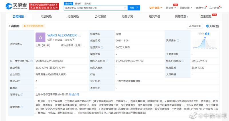 ▼據了解,「成功金字塔」科貿有限公司成立於去年12月,經營範圍包括電子產品銷售、音響設備銷售、服裝服飾批發、企業管理諮詢、項目策劃、公關服務等等,跟娛樂圈的直接關聯度偏低。
