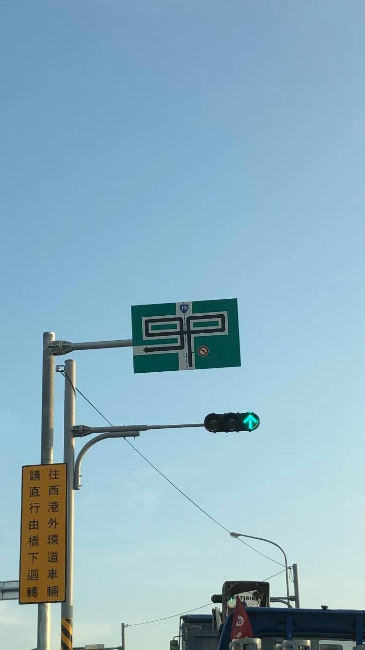 ▼有網友認出照片中的地點,原來這是台南市西港區,西港大橋下新開的路,「台19線的特別9P走向指示牌」。網友介紹說,這樣設計是因為橋上有分隔島,所以沒辦法直接左轉。雖然看起來複雜,但有台南人覺得很棒:「認真希望台南市區內也能這樣,很多路口已經很小了,還在內線等左轉佔車道,原本內線直行的還要想辦法彎出去外線才能繼續直行,這車能不塞嗎?」