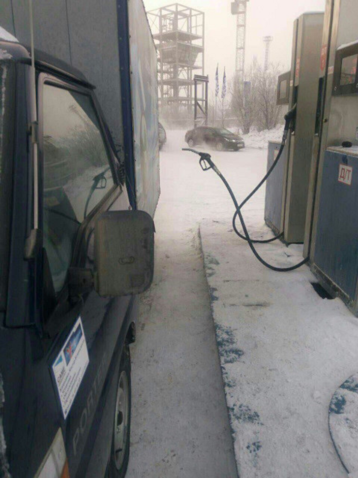 ▼10.在西伯利亞-56℃的極寒天氣中,加油站的油槍都被定格在了半空。