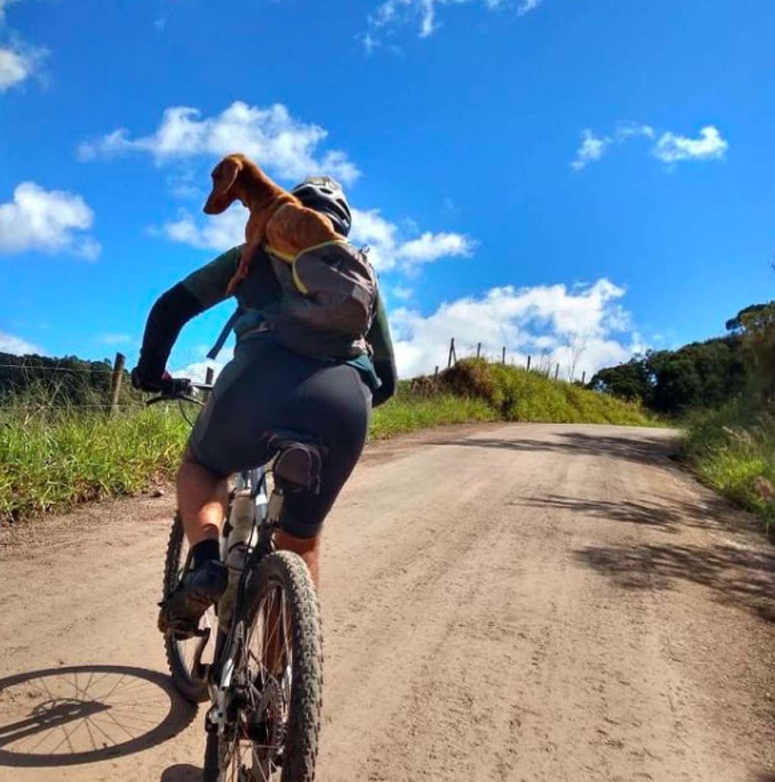 ▼Ladislau不忍心丟下狗狗,但那天氣溫很高,回程還有40多公里,兩人已經很疲憊了,載狗狗回家非常困難。一番掙扎之後,他還是打開背包,讓狗狗坐在裡面。狗狗好像也知道他們是在救自己,一直安穩地趴在Ladislau的背上,看起來很乖巧。