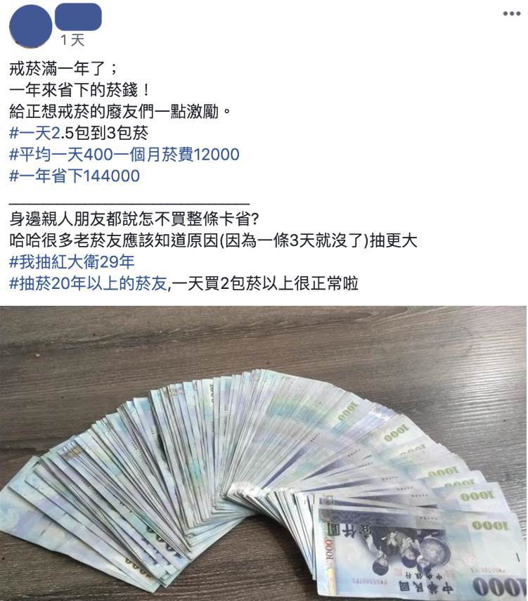 ▼現在1年過去,原po已經成功戒菸。他把省下的菸資存下來,將厚厚一疊鈔票平鋪在桌面,表示:「給正想戒菸的網友們一點激勵,一天2.5包到3包菸,平均一天400元,一個月菸費1萬2000元,一年省下14萬4000元。」