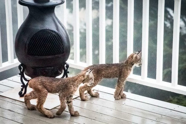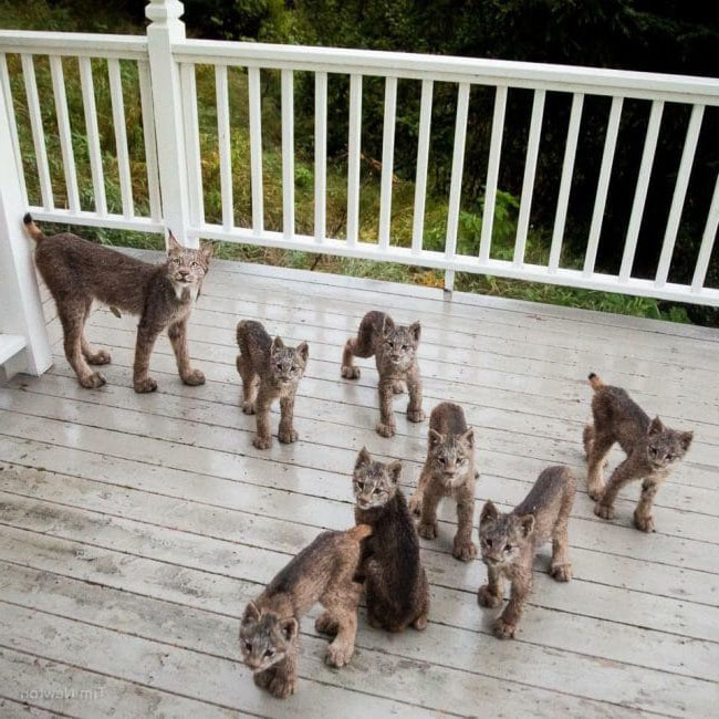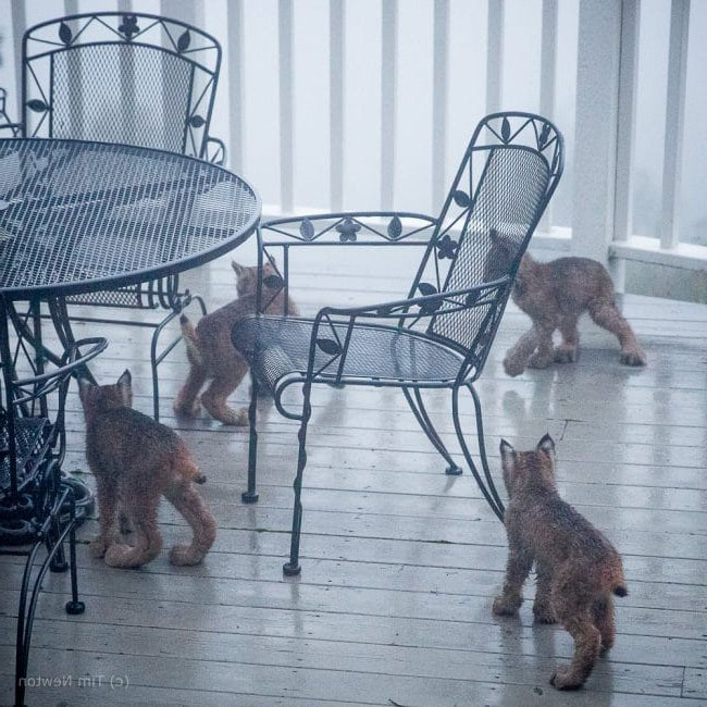 阿拉斯加網友Tim Newton住在自然生態區附近,經常有野生動物跑到他家的後院玩耍。有一天早晨,Tim被窗外的噪音驚醒,他怒氣沖沖拉開窗簾查看,竟發現猞猁媽媽帶著寶寶們在他家的後院玩耍,牠們跑來跑去、互相玩鬧,把Tim家的後院當成了遊樂場~