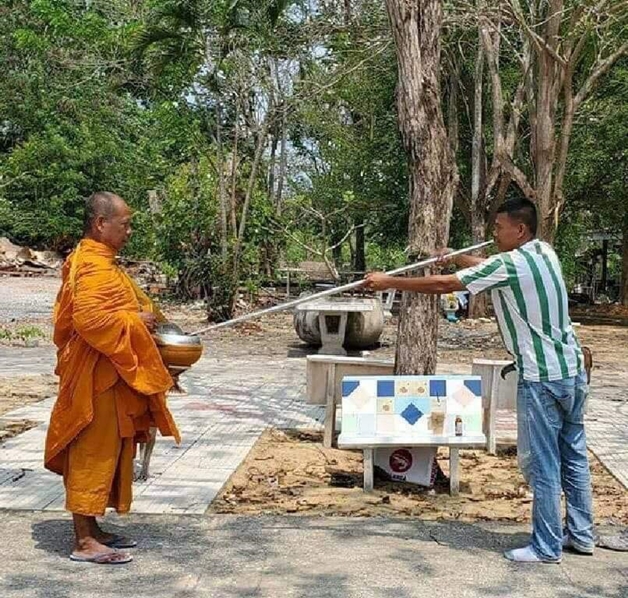 ▼泰國篤信佛教,路上或佛寺裡經常能看到師傅來化緣。但為了保持社交距離,給化緣品也要用長匙子。這是把福氣和健康都兼顧到了。
