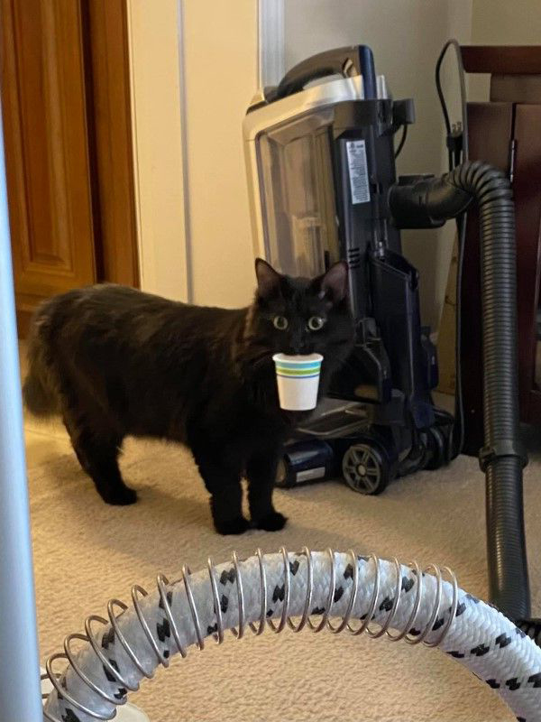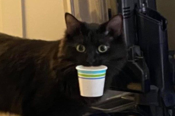 ▼打掃阿姨傳給Vicki一張照片,只見黑貓嘴巴裡叼著一個紙杯,睜著大眼睛看向鏡頭。阿姨解釋說,自己清掃到一半,就看到Vicki家的黑貓叼著一個紙杯跑過來。牠好像是體諒阿姨打掃很辛苦,所以才貼心地叼來紙杯,問阿姨要不要喝杯水或休息一會兒。