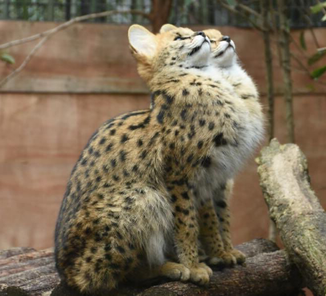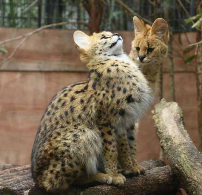 ▼藪貓是一種原生於非洲的中型貓科動物。跟家貓相比,藪貓的身型更加修長,腿細長、尾巴短,耳朵又大又圓,外表很有特色。藪貓性格警惕,看起來難以親近,但牠們的一舉一動都很可愛,就像照片中這兩隻複製貼上一般的藪貓,看起來萌萌的。
