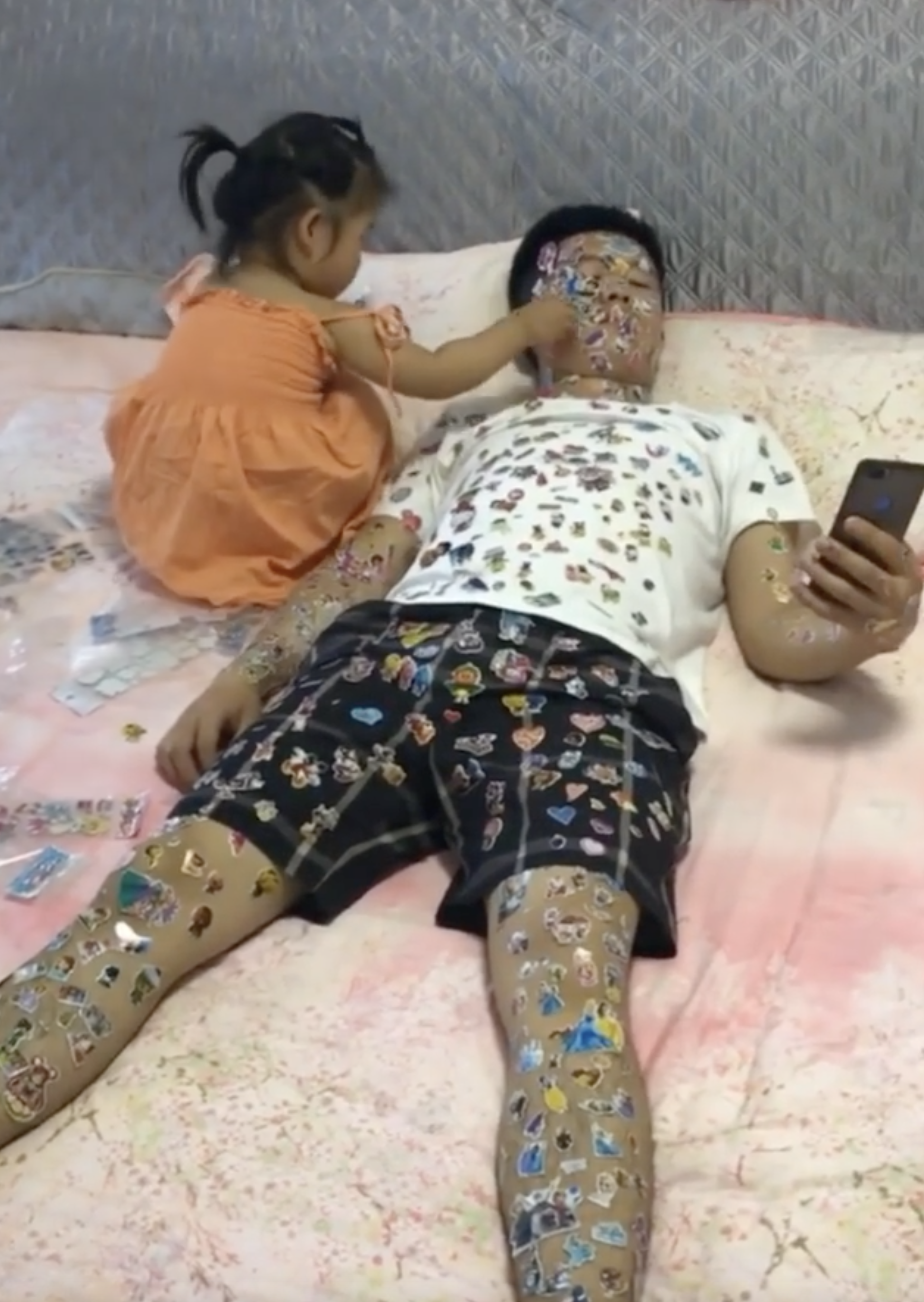 ▼從影片中可以看到,床上有很多貼紙,穿著橘色小洋裝的女兒坐在床上,將貼紙一張張貼在爸爸的身上。爸爸的臉、脖子、上衣、手臂、褲子、腿和腳都被貼滿,但還是淡定看手機,任由女兒繼續貼。原po開玩笑說:「想騙你們生個孩子但是說服力太低了。」