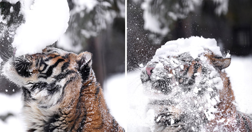 網友@rikunow說:「很多人覺得老虎是兇猛的野獸,其實牠們的性格和貓咪一樣天真可愛。」大家看到這一組照片紛紛留言說:「看起來像美國動漫才會出現的動物」、「雖然老虎的形象很嚇人,但這很可愛」、「根本就是貓」、「這組照片讓我回想起童年」、「秒變白虎」、「太適合當作虎年賀卡了」、「即使被雪打臉也不慌張,氣勢真磅礡」、「從沒見過這麼可愛的老虎」。