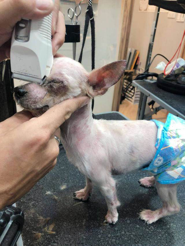 ▼Alicia非常心疼小歐,給牠剃毛時發現牠的狀況很糟糕,不僅毛髮打結、皮膚也有問題,後腳因為長期困在籠子裡無力行走。但牠非常乖巧,全程不吵不鬧。Alicia實在不忍心將小狗送去收容所,最後決定自己收編牠,給牠一個家。