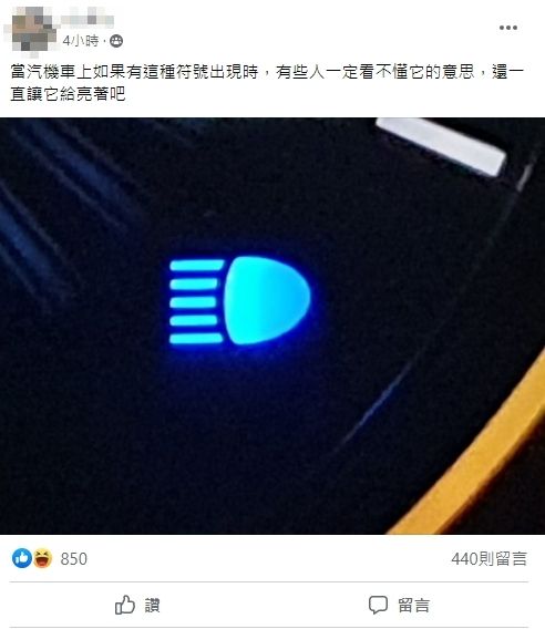 ▼原po表示,汽、機車儀錶板上的這個「藍色水母」符號,部分駕駛看不懂它的意義,行駛過程中總是肆無忌憚地開啟。「當汽機車上如果有這種符號出現時,有些人一定看不懂它的意思,還一直讓它給亮著吧」。