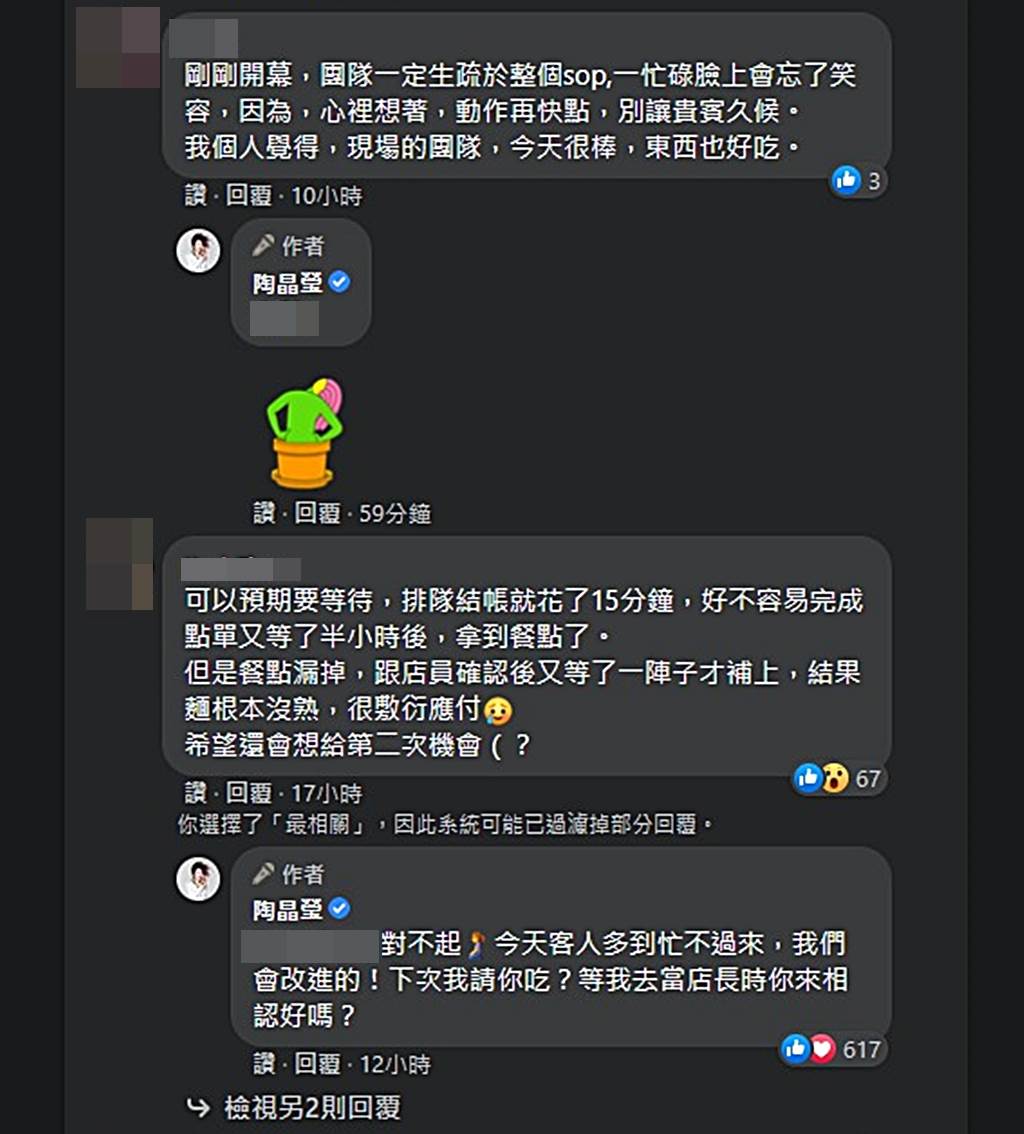 ▼不過有網友留言反映說,光是排隊結帳就花了15分鐘,好不容易點單完成後,又等了半小時才拿到餐點,「但是餐點漏掉,跟店員確認後又等了一陣子才補上,結果麵根本沒熟,很敷衍應付。」對此陶晶瑩親自回覆道歉,表示因為客人太多忙不過來,之後會再改進。她還說:「下次我請你吃?等我去當店長時你來相認好嗎?」