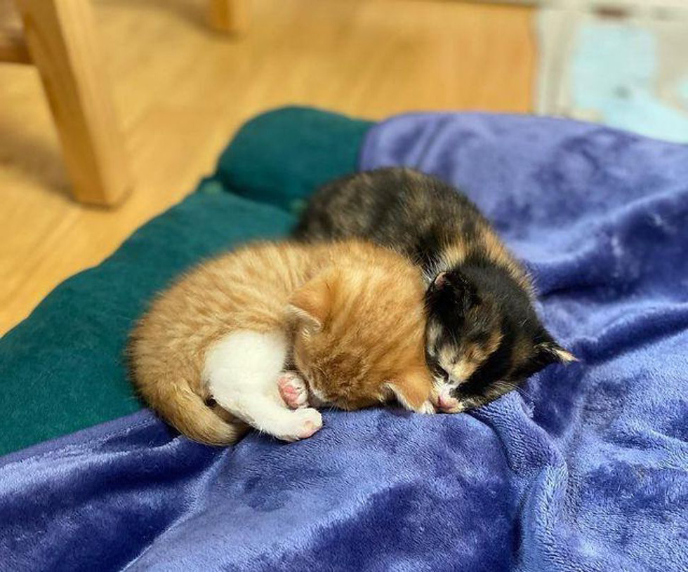 ▼救援人員給貓咪們洗澡,又給牠們餵奶。牠們肚子太餓,很快就把奶喝光了。吃飽喝足後,2隻小貓窩在舒服的床上安心睡著,這應該是那麼長時間以來牠們第一次睡得如此安穩。