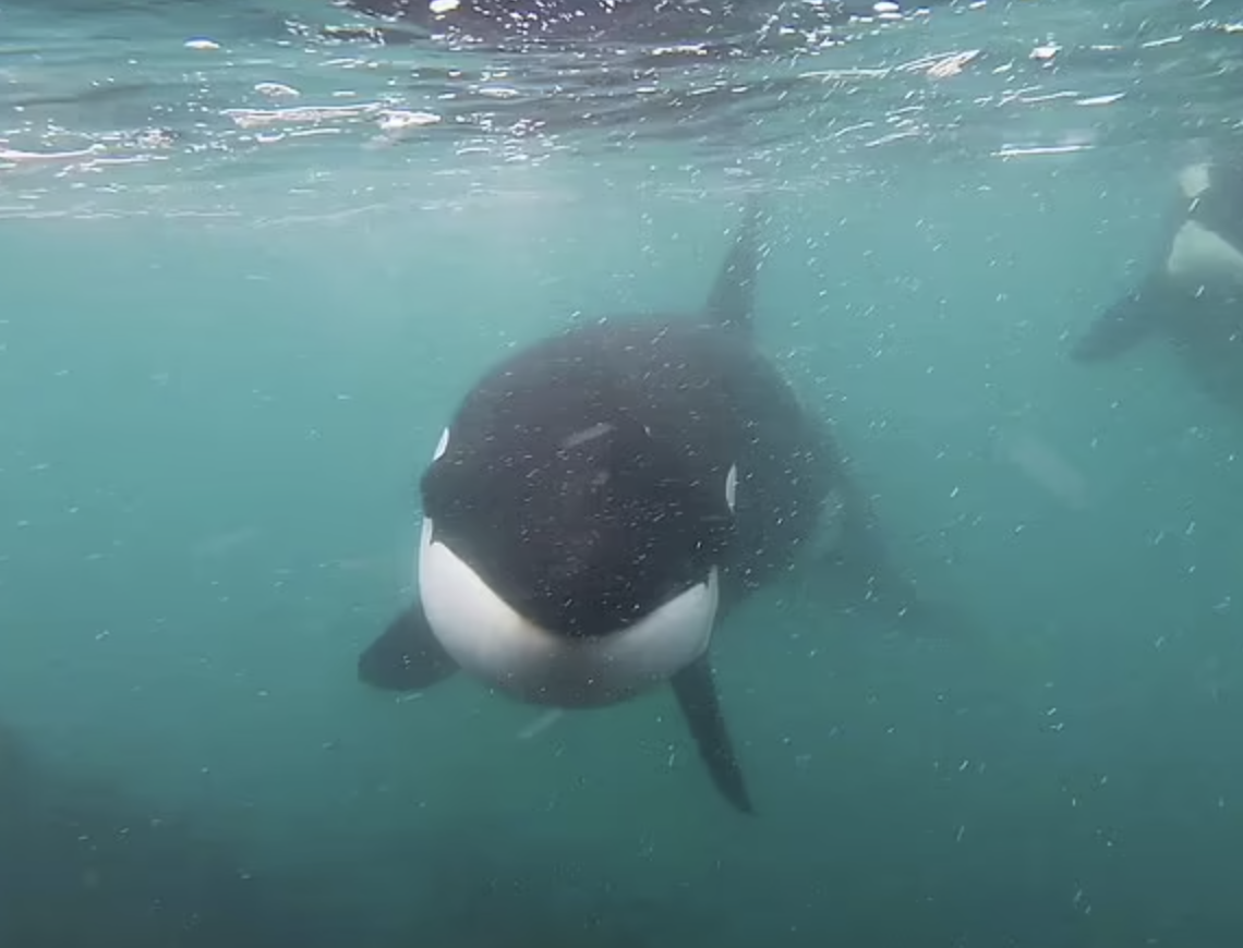▼Steve表示,他一開始看到2隻虎鯨脫離群體朝自己游過來,非常擔心自己的安全。後來他才意識到,那2隻虎鯨只是想來打個招呼而已。這群虎鯨非常聰明,也很友善,牠們好奇地在Steve旁邊游來游去,還歪頭觀察人類,那模樣非常呆萌。