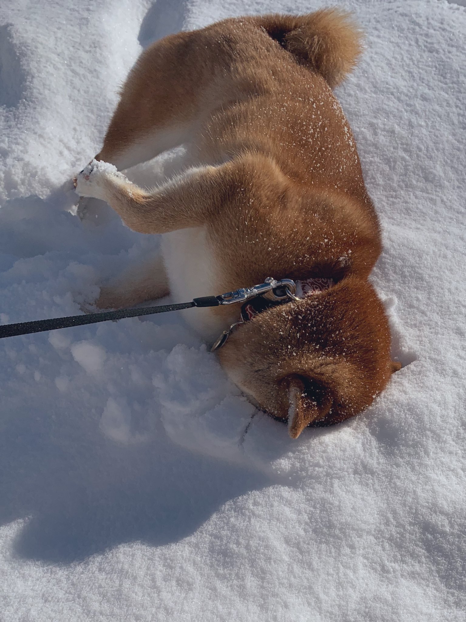 ▼春瑠將臉埋在雪中,躺在雪地上,手手有一下沒一下地刨雪。主人看得一頭霧水,牠到底是要剷雪,還是鑽進雪地裡?