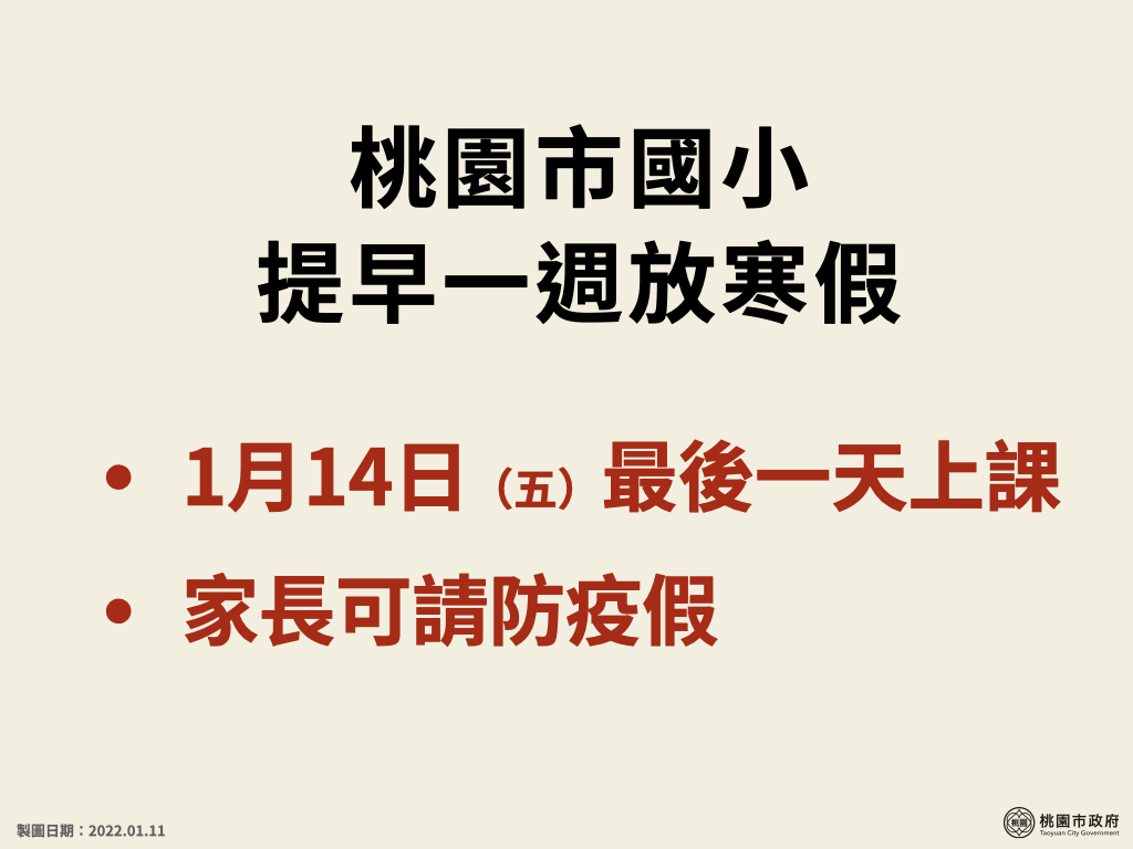 桃園市長鄭文燦在疫情說明記者會上表示,考量已經有3所國小因學生確診要停課到寒假,桃園市公私立國小將提早1周放寒假,14日是最後一天上課。經桃園市政府教育局評估後決定,桃園市公幼、附幼也比照辦理。