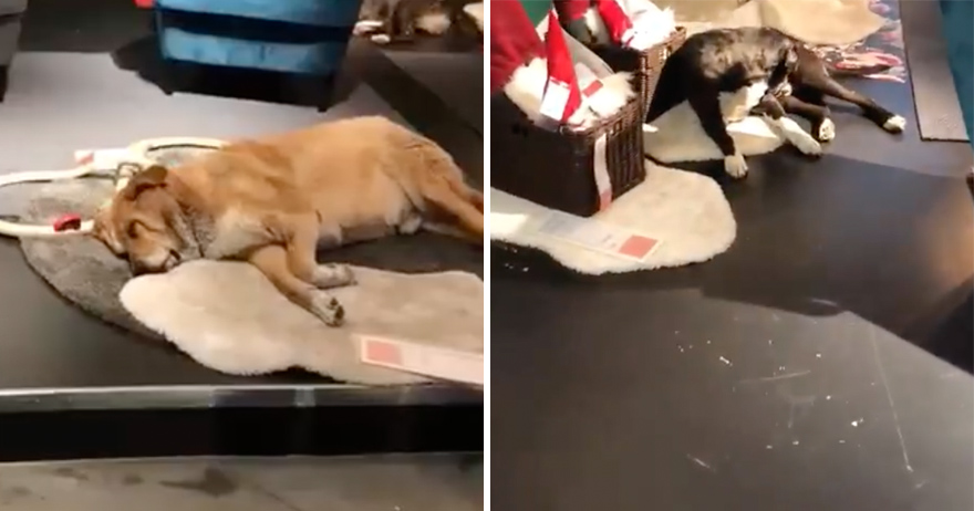 ▼有一天義大利女子Martine Taccia和女兒Catania去逛IKEA時,發現家具區的地毯上躺著一隻金金。牠不在乎路過的客人,躺在那裡睡得非常香甜。她們繼續往前走,發現聖誕樹旁趴著另一隻汪汪。狗狗們怡然自得,就像生活在家裡一樣,看起來非常愜意。