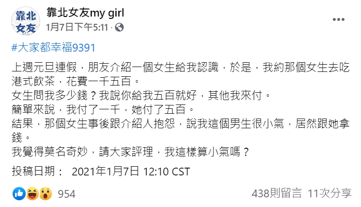 ▼原po忿忿不平說:「請大家評理,我這樣算小氣嗎?」元旦連假時,朋友介紹一個女生給他認識,兩人相約去吃港式飲茶,共花了1500元。當時女生問多少錢,原po就表示:「你給我500就好,其他我來付。」原po對這次聯誼很滿意,認為跟那名女生相處得不錯,沒想到事後從介紹2人認識的朋友那裡得知,女生回去後抱怨他「很小氣,居然跟她拿錢」。