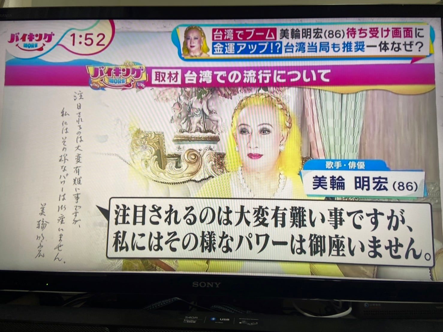 ▼現居台北的日本作家近藤彌生子(Yaeko Kondo)在臉書發文說,自己受訪日本富士電視台節目《バイキングMORE》特別專題報導「美輪明宏之亂」,節目播出最後,竟出現了美輪明宏給台灣人的親筆信,內容提及「雖然受到大家的關注是一件非常榮幸的事情,不過我沒有這種能量」。