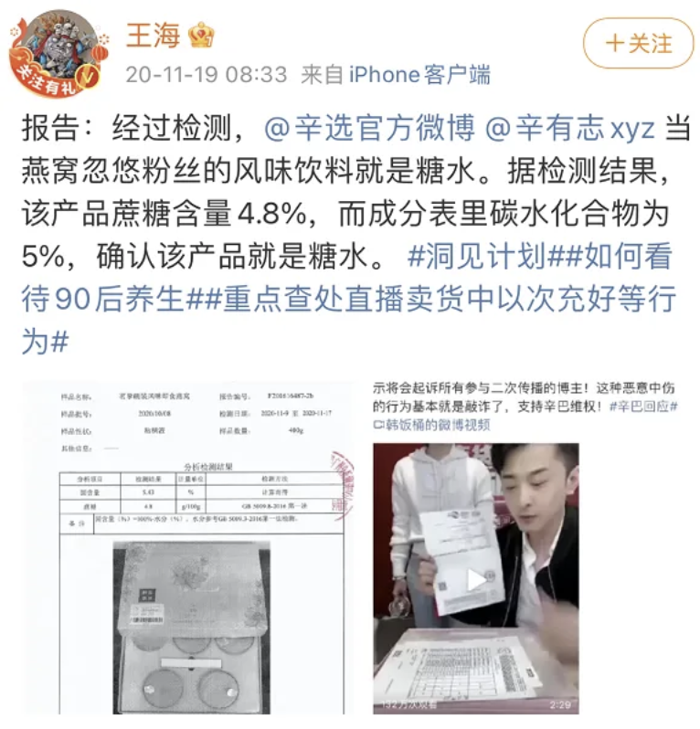 ▼辛巴的團隊沈默8天才出面說明,表示團隊回頭去做了深度的產品通路檢測,結果發現產品的確有誇大宣傳事實,製作方還迴避責任、不願承擔。最後辛巴團隊承諾,「召回直播間銷售的全部產品,承擔退一賠三責任」。河南省消費者協會對辛巴、直播平台北京快手科技有限公司、廣州和翊電子商務有限公司和燕窩業者廣州融昱貿易有限公司等提吿,要求「退一賠三」。