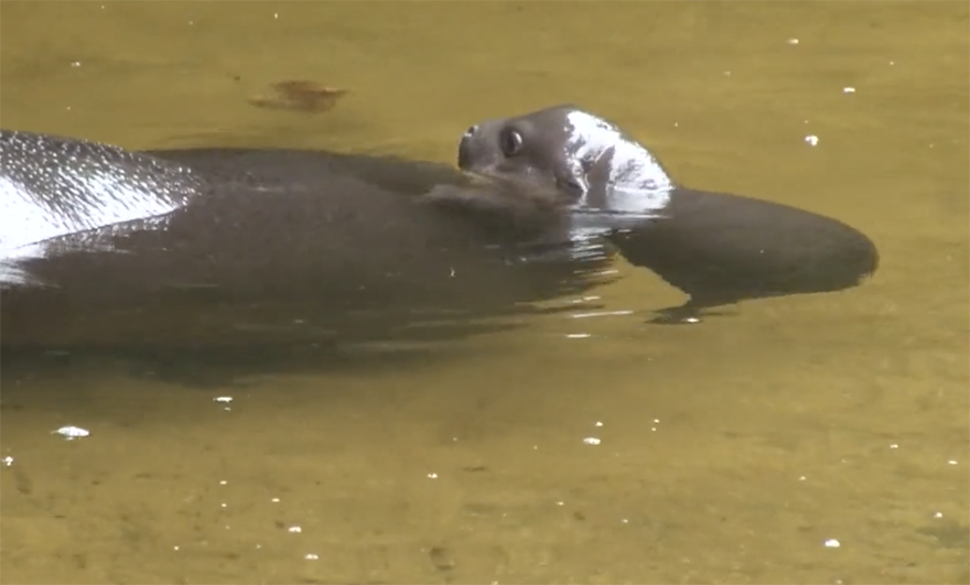 侏儒河馬比一般河馬的體型要小一些,但跟一般的河馬一樣,牠們也需要靠水來滋潤皮膚、降溫,還會分泌偏紅色的汗水。原來河馬的汗水中含有一種叫「河馬汗酸」的物質,具有防曬的效果,非常神奇。第一次學游泳的Obi是不是很Q萌?