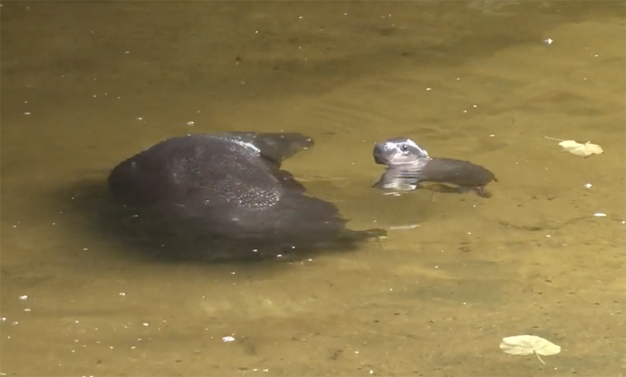 ▼Obi下水後緊緊跟在媽媽身邊。河馬媽媽淡定從容,但Obi非常緊張。牠頻頻將頭露出水面換氣,一雙圓圓的眼睛睜得大大的,看起來很可愛。河馬媽媽慢慢走到深水區,Obi也跟了過去,但牠發現自己的小短腿無法踩到水底後,又往旁邊的淺水區游去。
