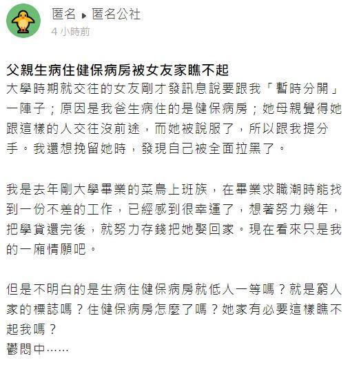 原po表示,他是一個菜鳥上班族,去年剛從大學畢業,有一份不差的工作。他覺得自己已經很幸運了,心想打拚幾年把學貸還完,就努力存錢和女友結婚。沒想到女友突然傳訊息說要「暫時分開」一陣子,原因是他爸爸生病住健保病房,女友媽媽覺得和這樣的人交往沒前途。